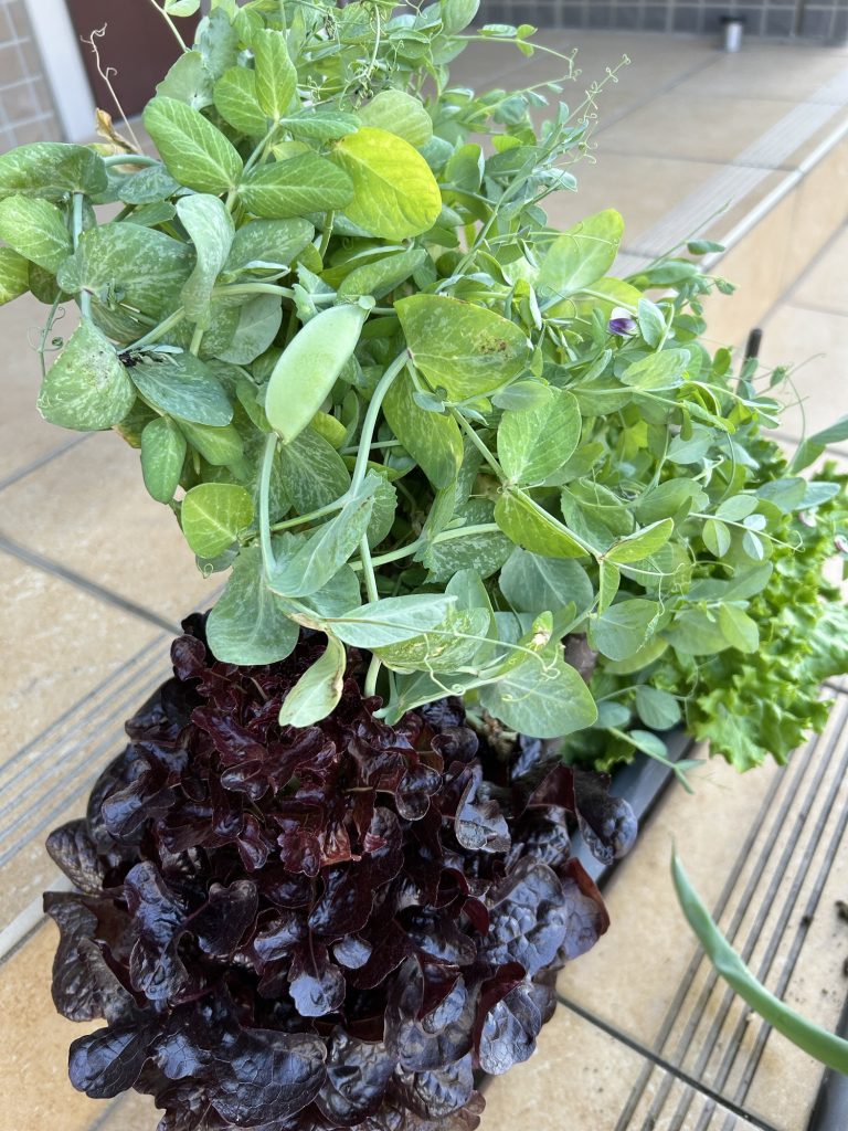 ちょっと見づらいですが、豆苗さんのジャングルに可愛い豆ができていました。紫の可憐な花が咲いてるなぁと見ていたのですが、いつの間にか豆ができてました。これももうちょっと大きくなった時に穫って食べてみたいと思います。